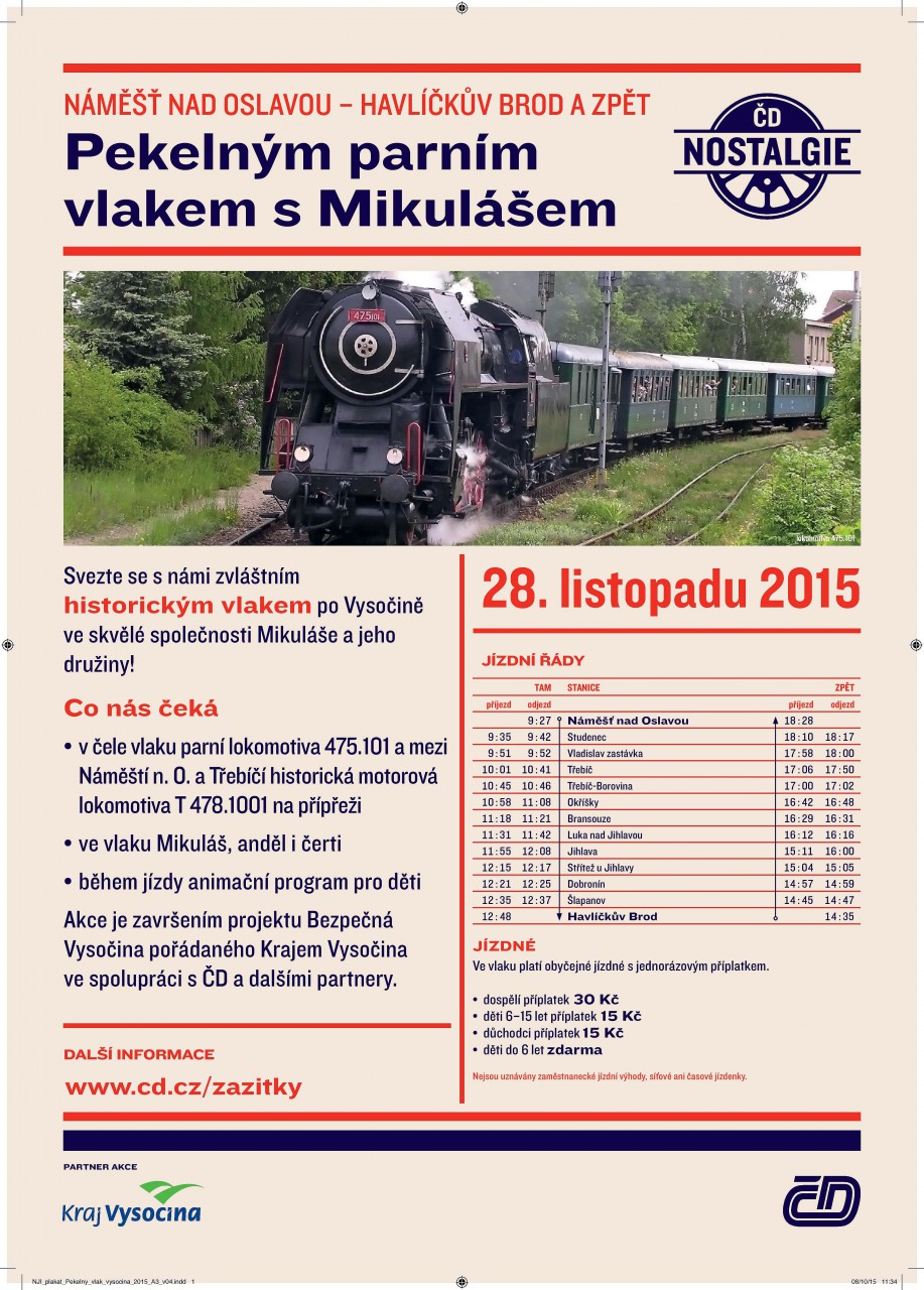 Svezte se s námi zvláštním historickým vlakem, v němž bude o zábavu postaráno. Společnost vám při jízdě mezi Náměští nad Oslavou, Třebíčí, Jihlavou a Havlíčkovým Brodem bude dělat Mikuláš, anděl i čerti a děti se mohou těšit na zábavní program. -