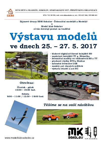 Model klub Sokolov, ve spolupráci s Josefem Němečkem, pořádá ke dni dětí tradiční výstavu. Kromě klubového digitálně řízeného kolejiště H0, bude k vidění mnoho nejrůznějších modelů lokomotiv, vagónů i aut ve velikostech H0 a TT, plechové vláčky ETS a Merkur a zahradní železnice LGB. Letos bude výstava doplněna modulovým kolejištěm velikosti TT pana Josefa Němečka z Přeštic. Modeláři z letecké a automobilové sekce představí své modely letadel a aut. Vstup zdarma.